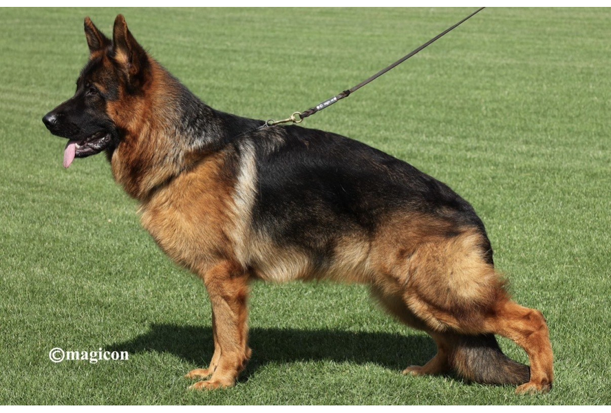 | Keurbericht Groß, kräftig, gehaltvoll, sehr gutes Verhältnis, sehr typ- und ausdrucksvoll, kräftiger, sehr ausdrucksvoller Rüdenkopf. Hoher, langer Widerrist, gerader, fester Rücken, gute Länge und Lage der Kruppe, sehr gute Winkelungen hinten und vorne. Ausgeglichene Brustverhältnisse, korrekte Front, aus stabiler Hinterhand hinten etwas eng tretend, vorne gerade tretend. Weitausgreifende, kraftvolle Gänge mit wirksamem Nachschub und freiem Vortritt bei sehr guter Erhabenheit. Sicheres Wesen, TSB ausgeprägt. |