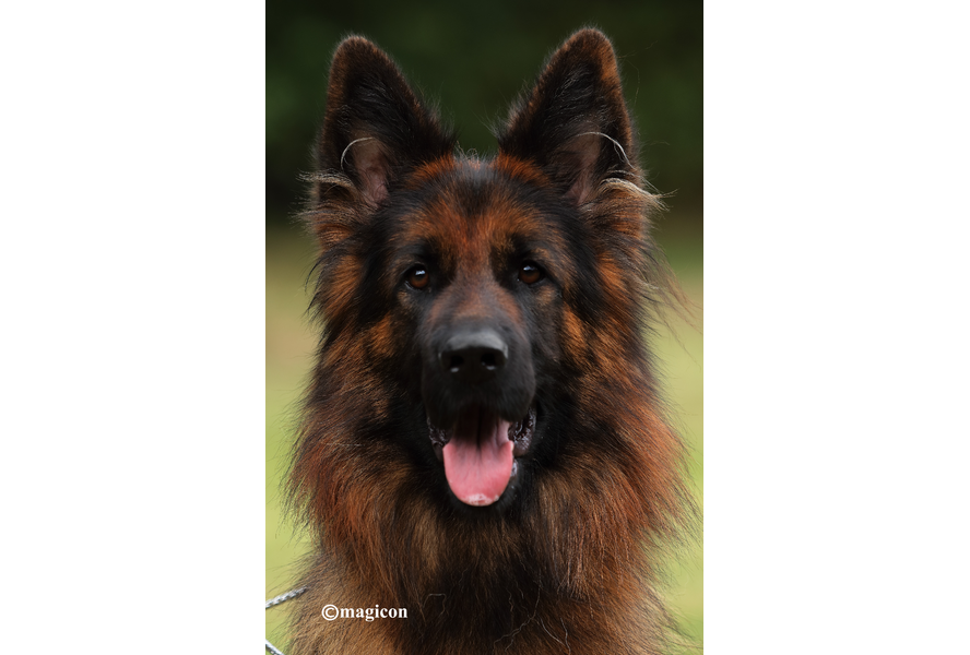 Keurbericht | Aan de grootte grens staande typvolle teef met goede verhoudingen. Zeer fraaie kleur. Normale schoft met gewelfde rug, afvallende kroupe, voor en achter goed gehoekt. Kon wat meer voorborst hebben, wat smalle borstkas. Stapt en draaft wat tenenwijd. Drift, Zelfverzekerheid, Belastbaarheid uitgesproken. DNA |