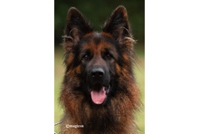 Keurbericht Aan de grootte grens staande typvolle teef met goede verhoudingen. Zeer fraaie kleur. Normale schoft met gewelfde rug, afvallende kroupe, voor en achter goed gehoekt. Kon wat meer voorborst hebben, wat smalle borstkas. Stapt en draaft wat tenenwijd. Drift, Zelfverzekerheid, Belastbaarheid uitgesproken. DNA |